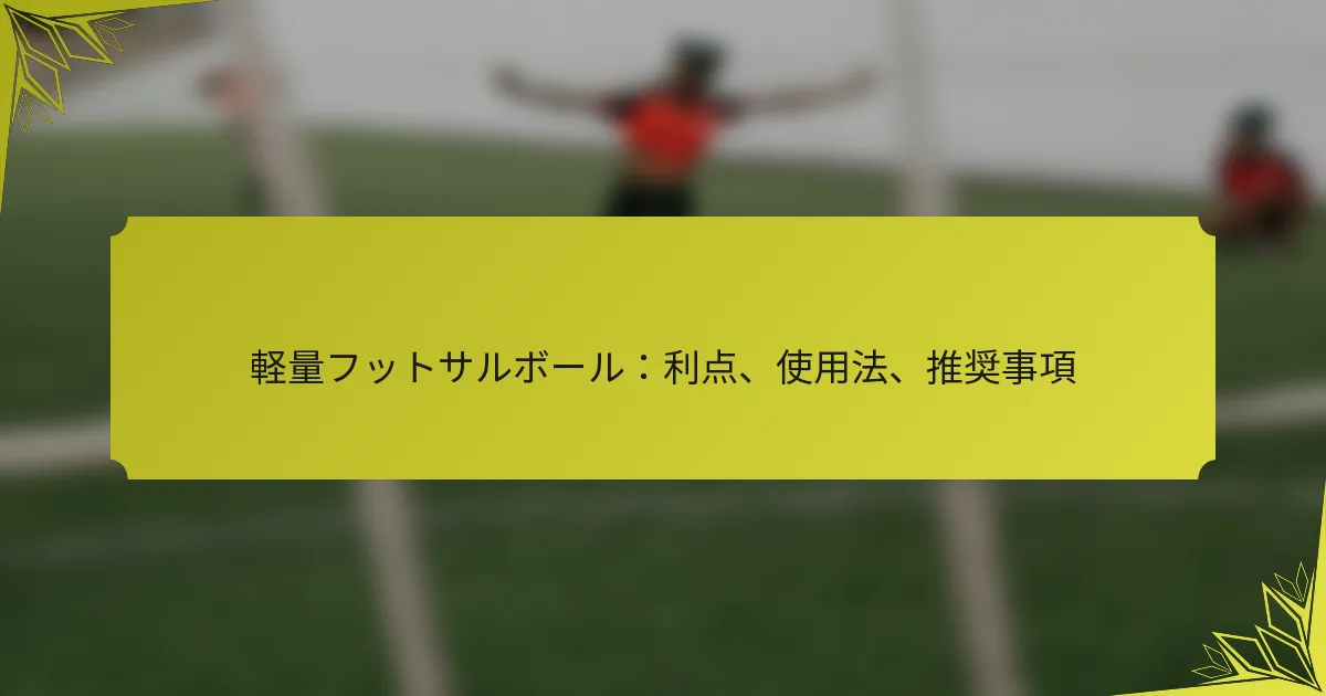 軽量のフットサルボールは、ゲームプレイ、スキル開発、選手の安全性を向上させる多くの利点を提供します。そのデザインは、コントロールと機動性を改善し、特に屋内プレイや若年層のトレーニングに適しています。フットサルボールを選ぶ際は、スキルレベルや予算などの要素を考慮し、自分のニーズに最適なものを見つけることが重要です。 Key sections in the article: Toggle 軽量フットサルボールを使用する利点は何ですか? コントロールと機動性の向上 選手のスキル開発の向上 プレイ中の怪我リスクの低減 屋内環境でのパフォーマンス向上 若い選手の参加を促進 軽量フットサルボールはどのように使用すべきですか? 軽量フットサルボールでのトレーニングのベストプラクティス ゲームシナリオへの軽量ボールの統合 長持ちさせるためのメンテナンステクニック スキル向上のための推奨ドリル どの軽量フットサルボールを購入することを推奨しますか? 異なるスキルレベルに対するトップブランドとモデル […]