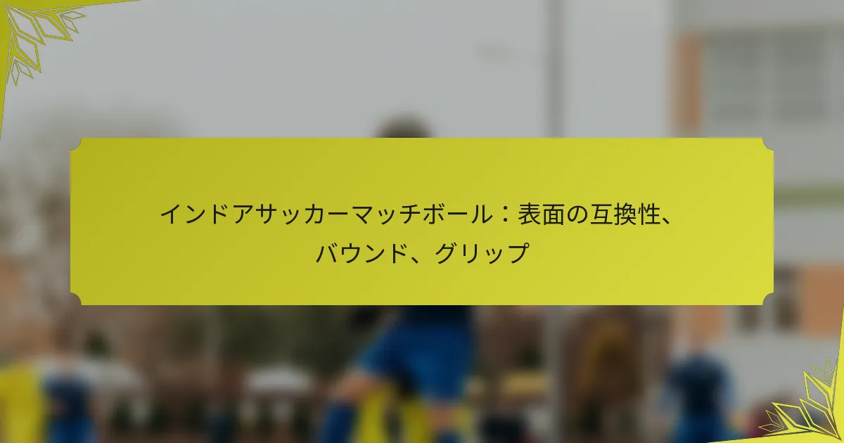 インドアサッカー用の試合球は、ハードウッド、人工芝、カーペットなど、さまざまなインドア表面でのパフォーマンスを最適化するように設計されています。表面の適合性、バウンスの質、グリップなどの重要な特徴は、ゲームプレイを向上させる上で重要な役割を果たし、選手がコントロールを維持し、正確なパスを実行できるようにします。これらの特性を理解することで、選手は特定のインドア環境に最適なボールを選択することができます。 インドアサッカー用試合球の主な特徴は何ですか? インドアサッカー用試合球は、インドア表面でのパフォーマンスを向上させるために特別に設計されています。主な特徴には、表面の適合性、バウンスの質、グリップ、材料構造が含まれ、これらはすべてゲームプレイに大きな影響を与えます。 異なるプレイ表面との表面適合性 インドアサッカーボールは、ハードウッド、人工芝、カーペットなど、さまざまな表面に最適化されています。各表面の種類は、ボールが地面とどのように相互作用するかに影響を与え、スピードやコントロールに影響を及ぼします。 ハードウッド:滑らかな表面を提供し、ボールの動きを迅速にします。 人工芝:やや粗いテクスチャーを提供し、ハードウッドに比べてボールの動きが少し遅くなることがあります。 カーペット:一般的に最も摩擦を提供し、ボールのスピードやバウンスに影響を与えます。 バウンスがゲームプレイとコントロールに与える影響 インドアサッカーボールのバウンスは、プレイ中のコントロールを維持するために重要です。適切に設計されたボールは、一貫したバウンスを持ち、選手がその動きを正確に予測できるようにします。 低バウンス:迅速なパスや近距離のコントロールに理想的で、狭いインドアスペースで好まれます。 中バウンス:コントロールと距離のバランスを取り、さまざまなプレイスタイルに適しています。 高バウンス:予測不可能なプレイを引き起こす可能性があり、インドアサッカーにはあまり望ましくありません。 ハンドリングとシューティングにおけるグリップの重要性 グリップは、選手がボールを扱い、シュートする方法に影響を与える重要な特徴です。良好なグリップを持つボールは、ドリブルやシュート中のコントロールを向上させ、全体的なパフォーマンスを高めます。 テクスチャーのある表面:多くのインドアボールは、グリップを改善するためにテクスチャーのある外層を特徴としています。 材料の選択:合成材料は、伝統的な革に比べて優れたグリップを提供することが多いです。 天候条件:インドア環境は通常安定した条件を提供しますが、湿度がグリップに影響を与えることがあります。 パフォーマンスに影響を与える構造に使用される材料 インドアサッカーボールに使用される材料は、その耐久性とパフォーマンスに大きな影響を与えます。一般的な材料には、合成皮革とゴムが含まれ、それぞれ異なる利点を提供します。 […]