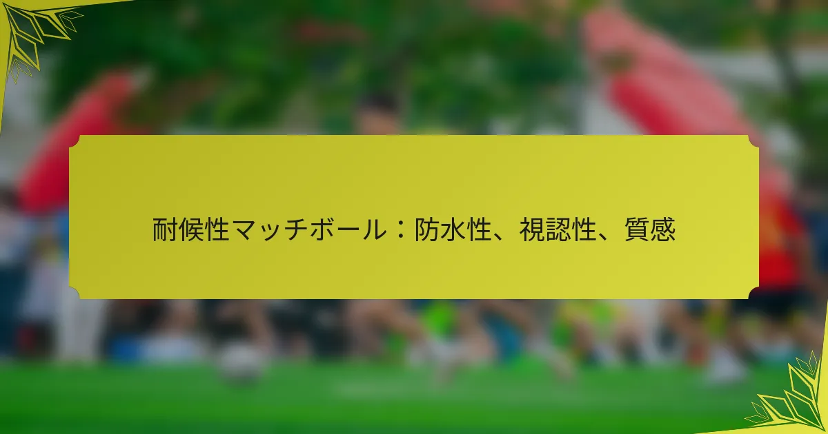 天候に強い試合用ボールは、雨や雪などの厳しい条件下でも優れたパフォーマンスを発揮するように設計されています。防水素材と視認性を高める機能を備えたこれらのボールは、天候に関係なく一貫したプレイアビリティと選手のコントロールを確保し、どんな試合にも理想的です。耐久性のある構造と明るい色合いにより、追跡が容易になり、悪環境でもスムーズにゲームを続けることができます。 Key sections in the article: Toggle 天候に強い試合用ボールの定義 天候に強い試合用ボールの主な特性 試合用ボールにおける防水性の重要性 悪天候時の視認性の役割 湿った条件での扱いやすさのためのテクスチャーとグリップ さまざまな気候における耐久性とパフォーマンス 防水機能は試合用ボールのパフォーマンスをどのように向上させるか? 試合用ボールの防水に使用される素材 防水試合用ボールのテスト基準 防水処理がボールの重量と感触に与える影響 防水試合用ボールの比較分析 天候に強い試合用ボールにとって重要な視認性の特徴は何か? 最適な視認性のための色の選択 […]